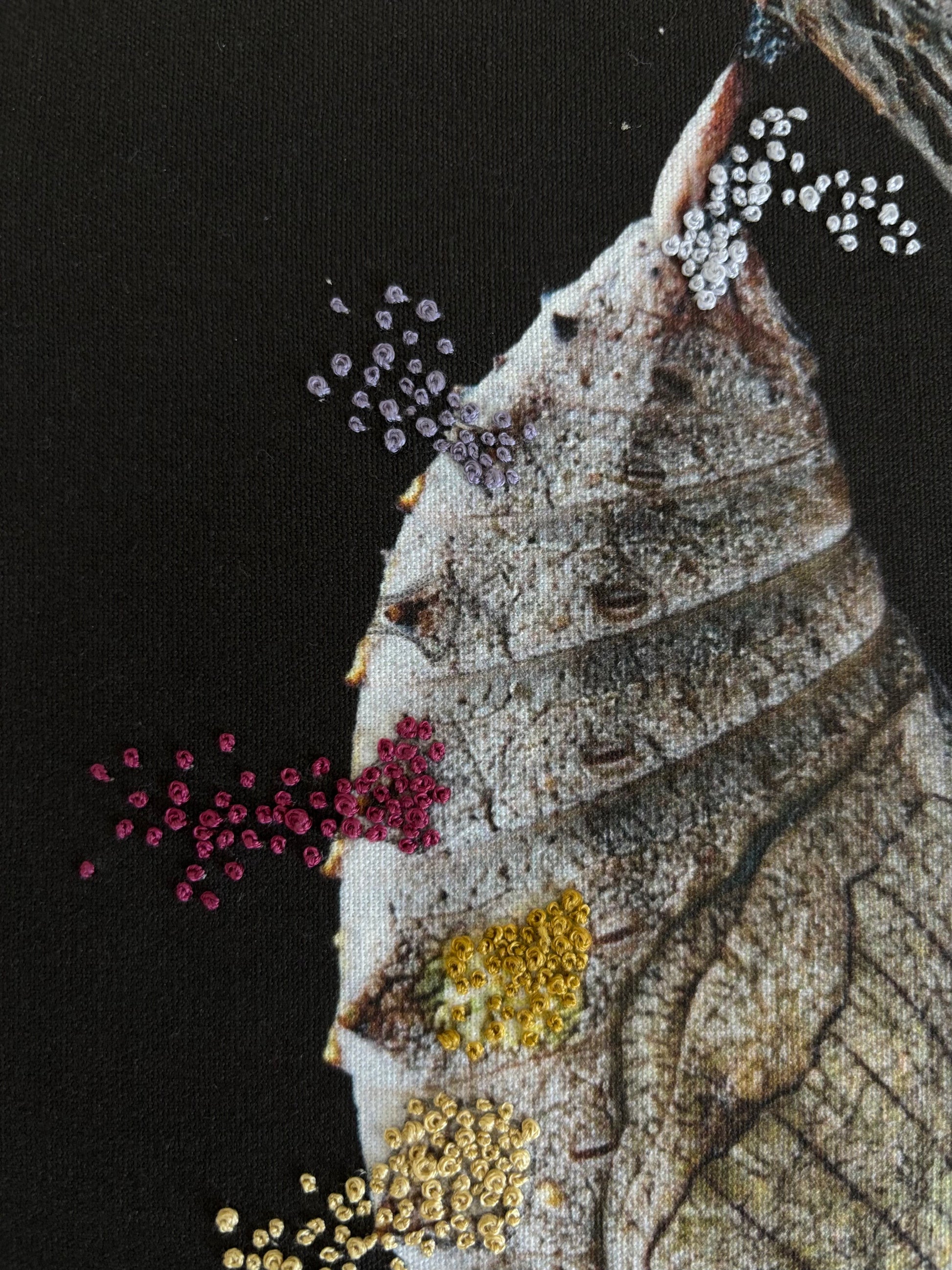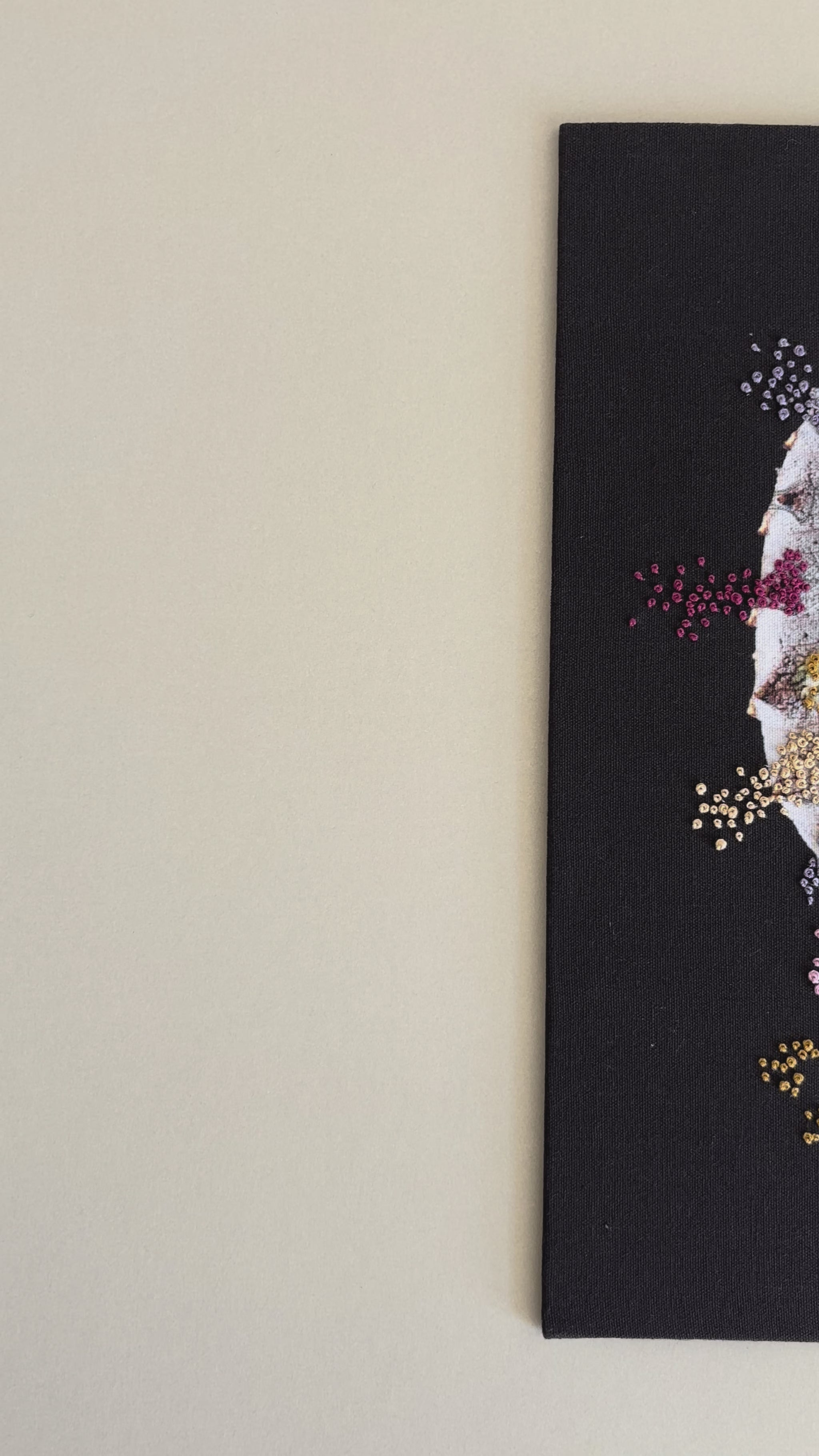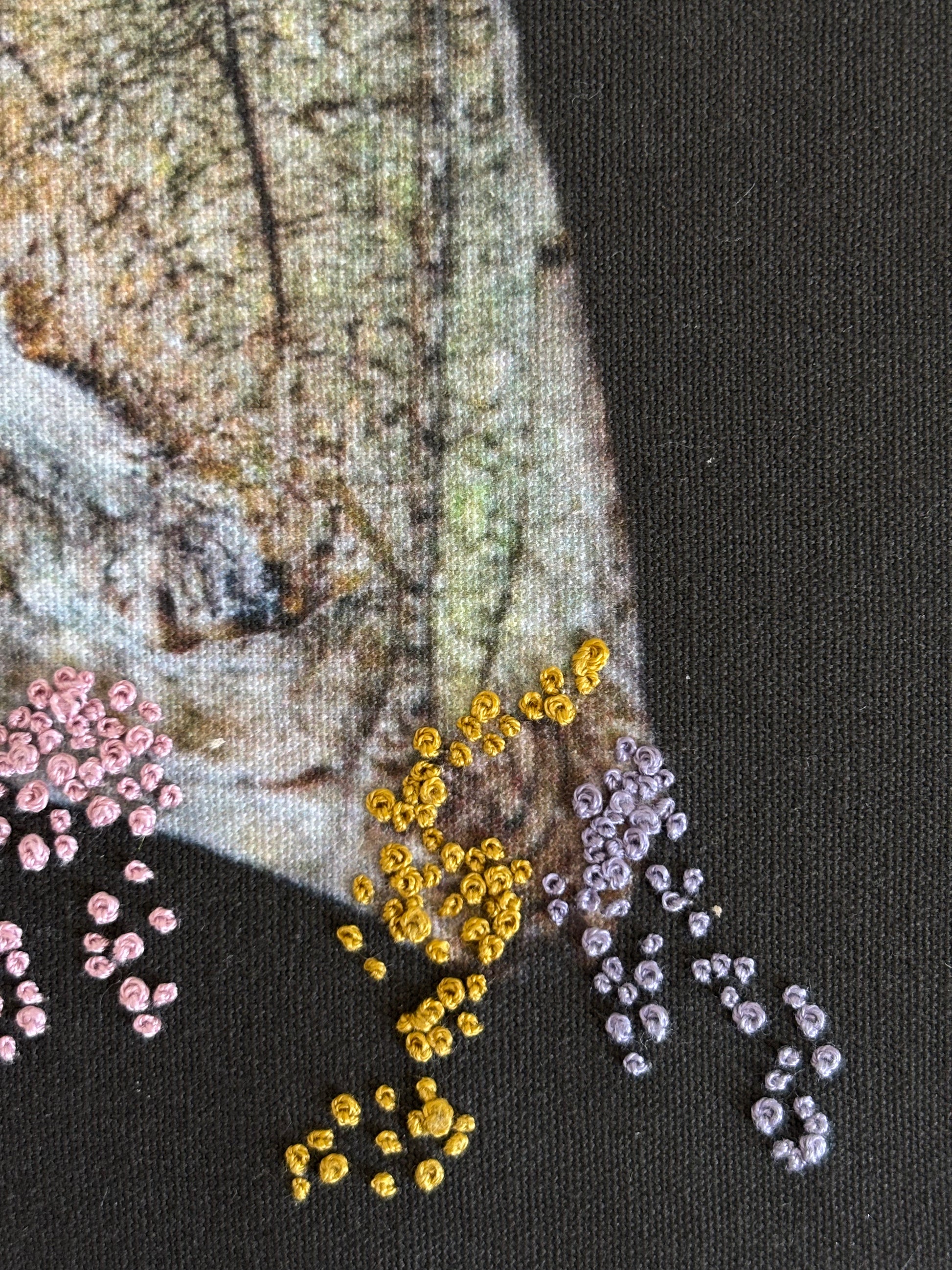 Esta obra comienza con una fotografía de archivo impresa en tela de algodón. Cada pieza es intervenida a mano con bordado artístico, punto por punto, creando una nueva narrativa visual cargada de textura, emoción y detalle.