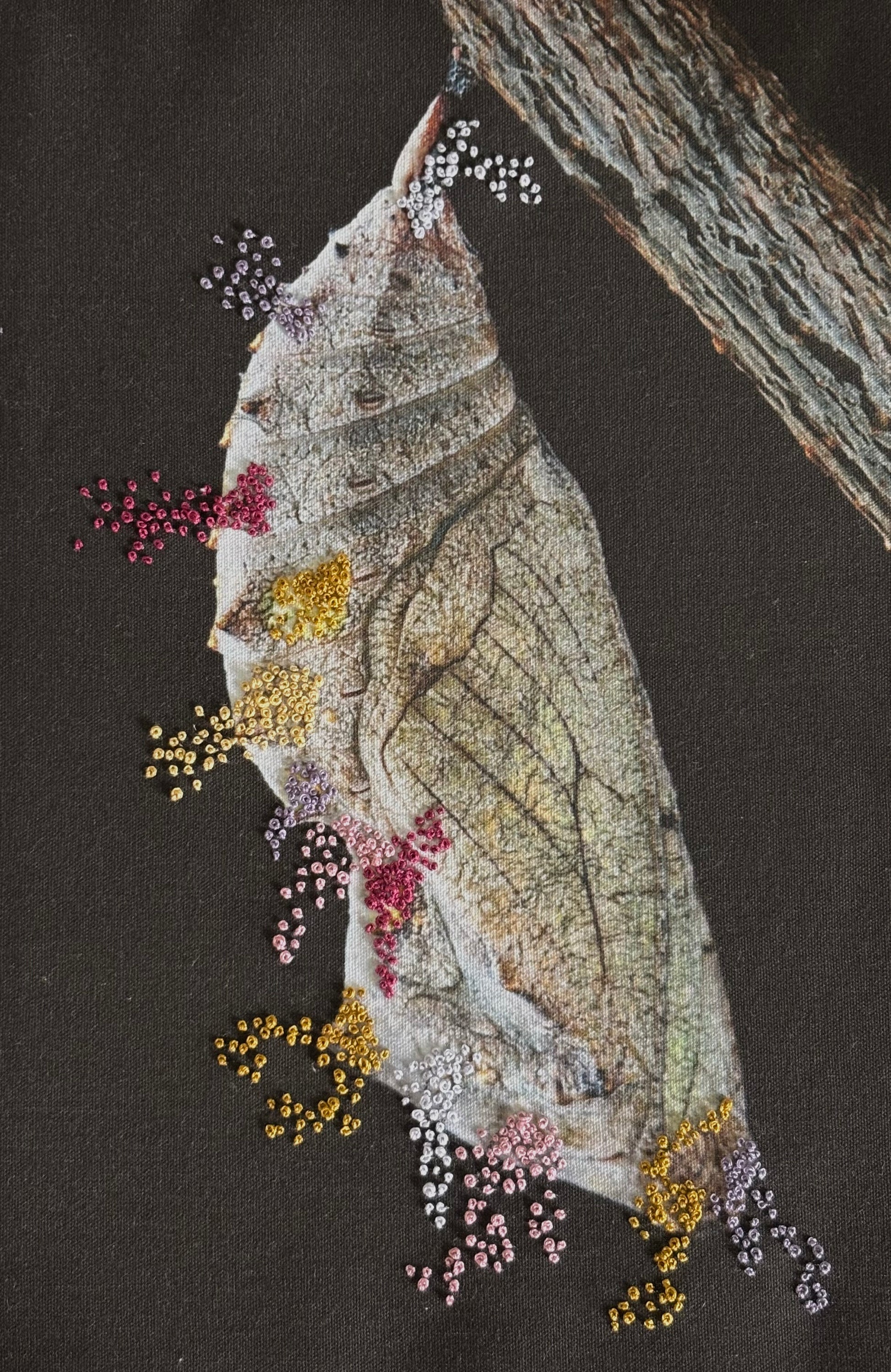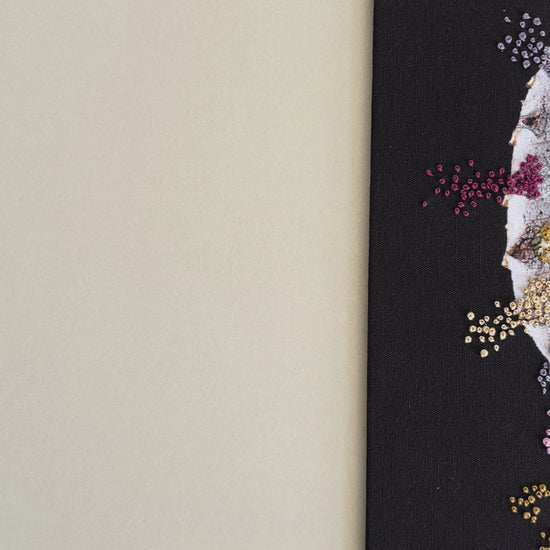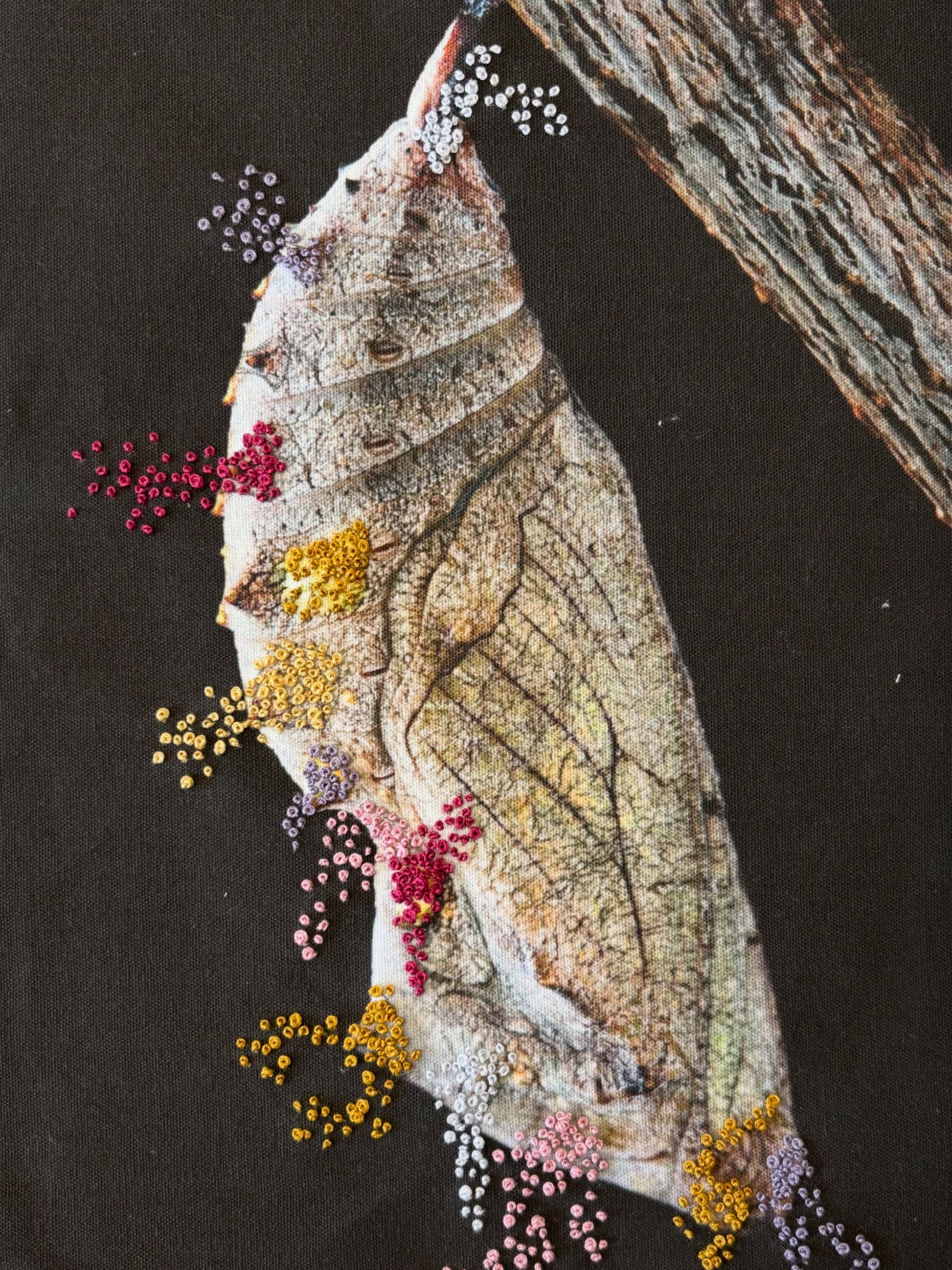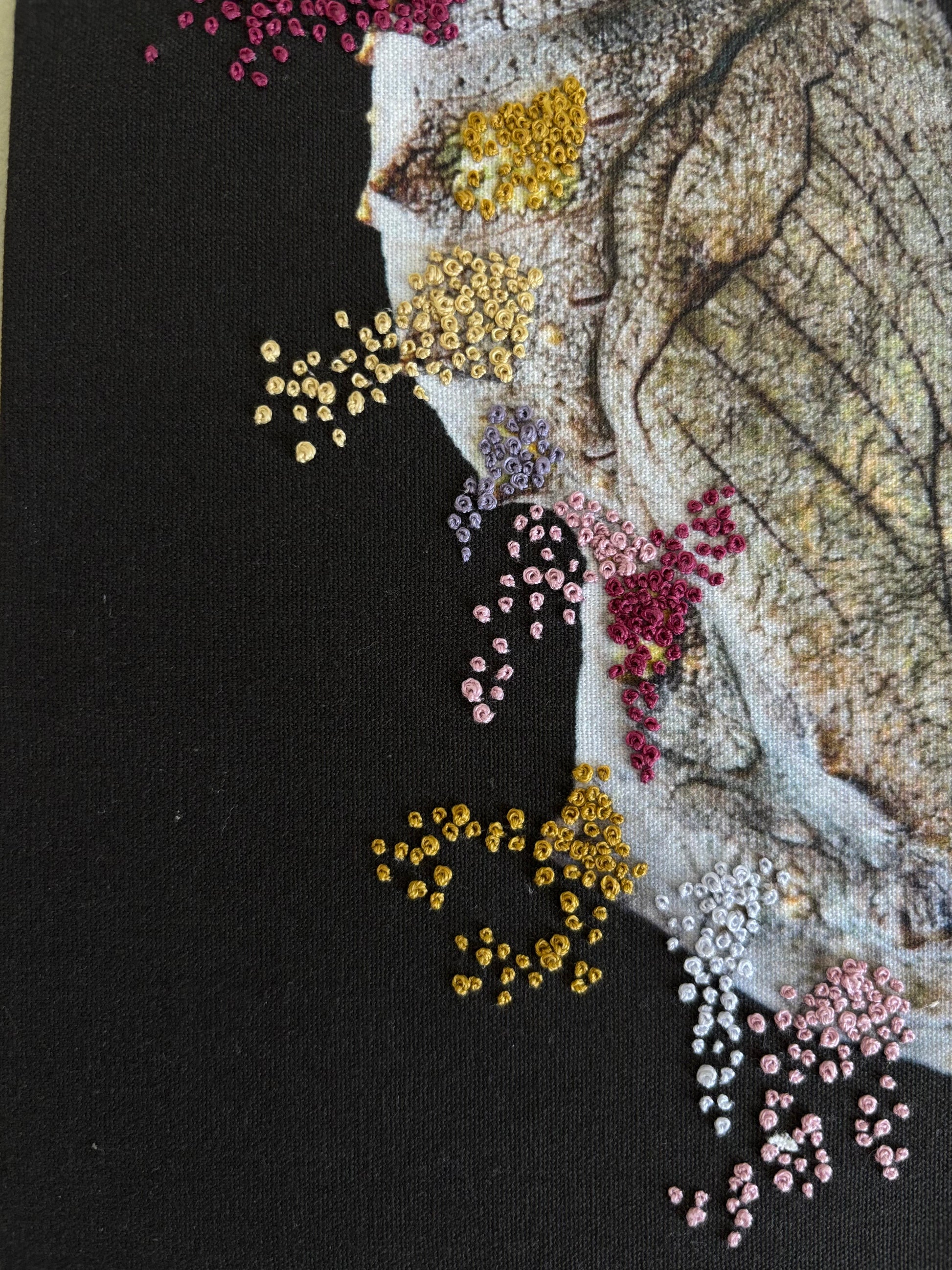 Esta obra comienza con una fotografía de archivo impresa en tela de algodón. Cada pieza es intervenida a mano con bordado artístico, punto por punto, creando una nueva narrativa visual cargada de textura, emoción y detalle.