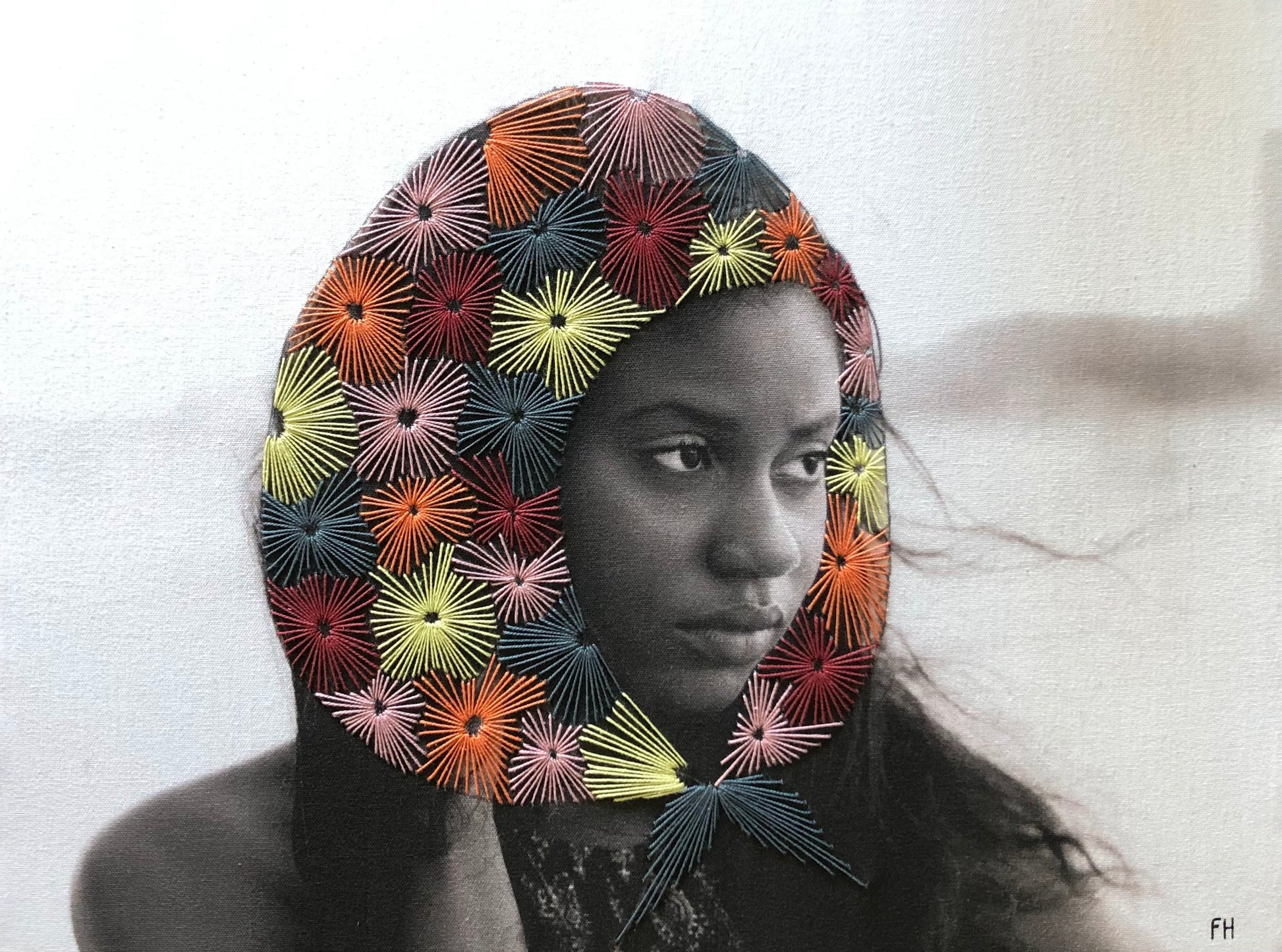 Esta obra comienza con una fotografía de archivo impresa en tela de algodón. Cada pieza es intervenida a mano con bordado artístico, punto por punto, creando una nueva narrativa visual cargada de textura, emoción y detalle.