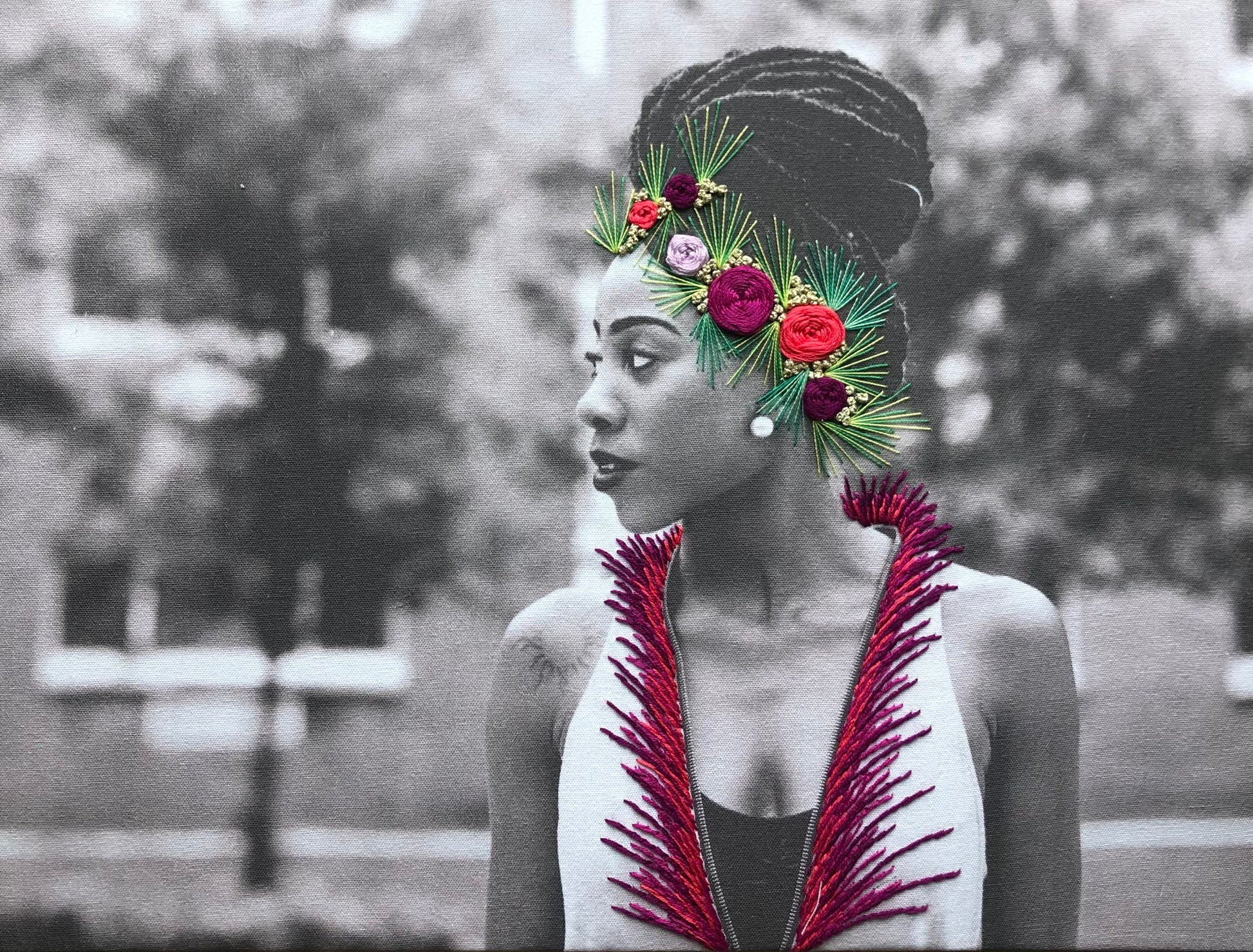 Esta obra comienza con una fotografía de archivo impresa en tela de algodón. Cada pieza es intervenida a mano con bordado artístico, punto por punto, creando una nueva narrativa visual cargada de textura, emoción y detalle.