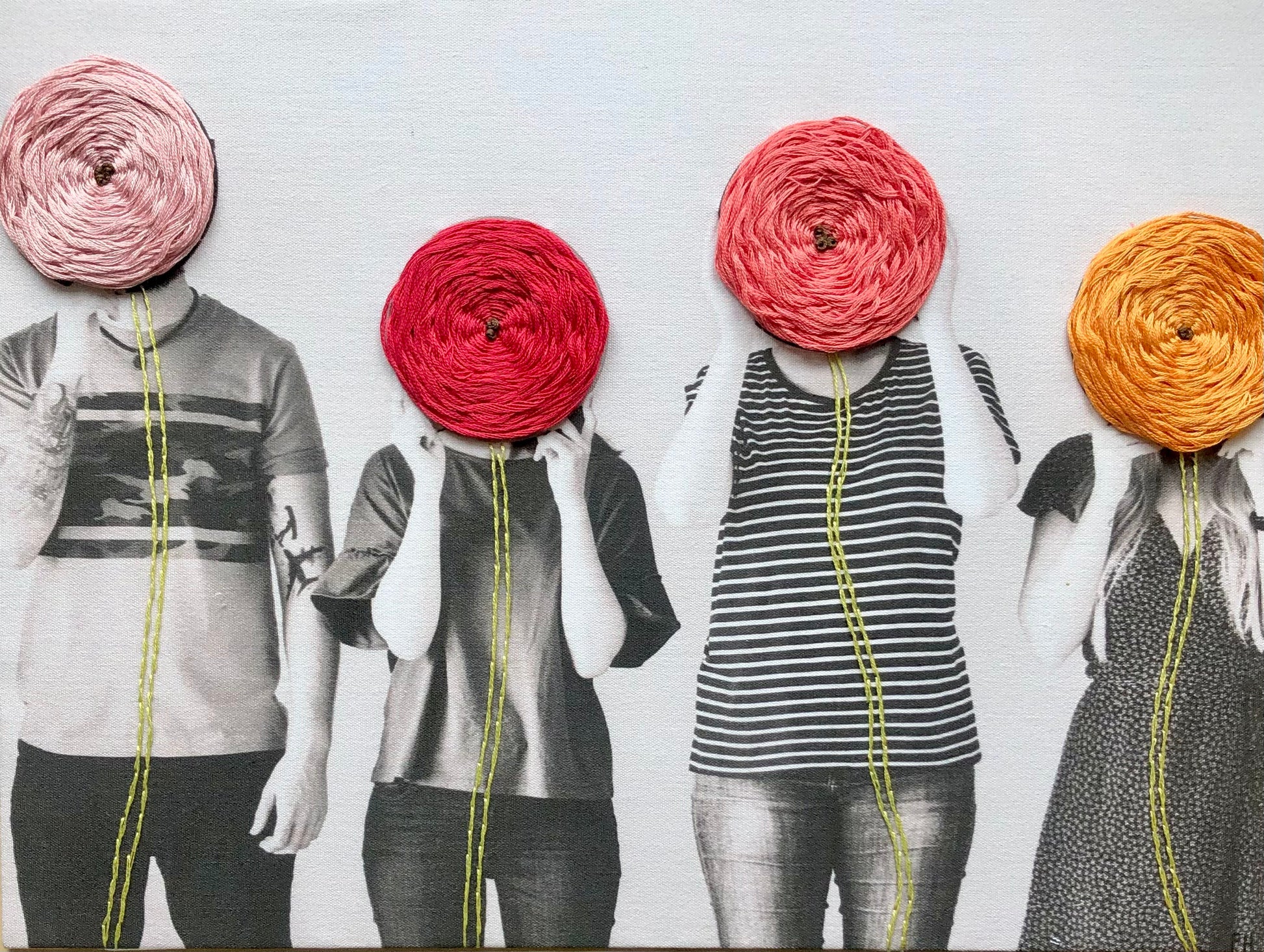 Esta obra comienza con una fotografía de archivo impresa en tela de algodón. Cada pieza es intervenida a mano con bordado artístico, punto por punto, creando una nueva narrativa visual cargada de textura, emoción y detalle.