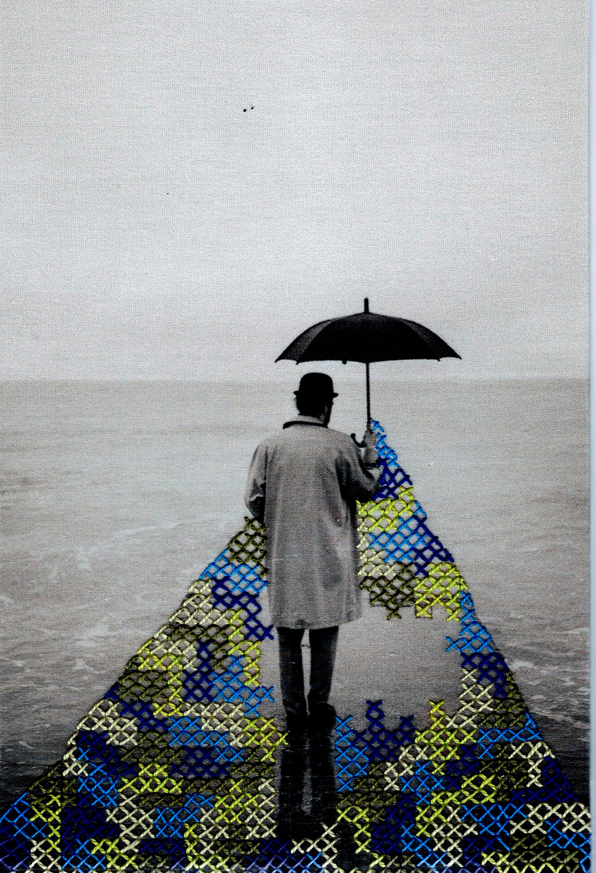 Esta obra comienza con una fotografía de archivo impresa en tela de algodón. Cada pieza es intervenida a mano con bordado artístico, punto por punto, creando una nueva narrativa visual cargada de textura, emoción y detalle.